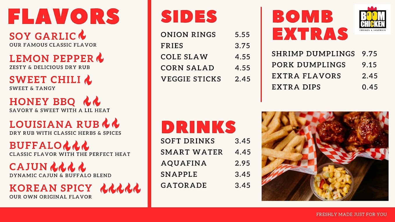Nestled at 1063 E Ave J Ste 101 in Lancaster, CA, Boom Chicken emerges as a cherished gem, a family-owned emblem established in 2018 with a singular mission: to infuse the Antelope Valley with the unparalleled savor of fresh, delectable chicken. With a specialty in crafting delicious, crispy wings kissed by a Korean twist, this small business has carved out a niche in the hearts of locals and visitors alike. Boom Chicken's dedication to quality is evident in their signature Boom Chicken Sandwich and their unwavering commitment to making each order of wings on demand. The result is a succulent feast that never fails to impress—crispy on the outside, tender on the inside, and bursting with flavors that dance on the palate.