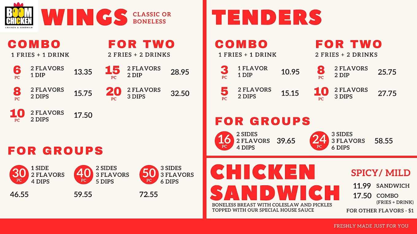 Nestled at 1063 E Ave J Ste 101 in Lancaster, CA, Boom Chicken emerges as a cherished gem, a family-owned emblem established in 2018 with a singular mission: to infuse the Antelope Valley with the unparalleled savor of fresh, delectable chicken. With a specialty in crafting delicious, crispy wings kissed by a Korean twist, this small business has carved out a niche in the hearts of locals and visitors alike. Boom Chicken's dedication to quality is evident in their signature Boom Chicken Sandwich and their unwavering commitment to making each order of wings on demand. The result is a succulent feast that never fails to impress—crispy on the outside, tender on the inside, and bursting with flavors that dance on the palate.